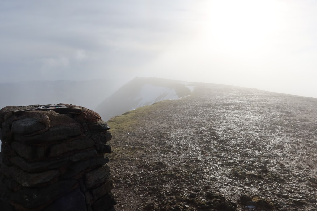 As always in the mountains, be careful on the descent. In limited visibility, it can be really easy to choose the wrong path back and end up descending the north ridge of Low Man, or even heading south instead of north if you are not used to taking compass bearings. These things can, and do happen. I was approached on my hikes the day I filmed this by two groups of people, within minutes of each other. They were all very well equipped in terms of clothing, but had neglected to take maps with them. Despite it being a well-trodden and popular peak, it can be surprisingly complicated to get down. Take a map and compass with you, with knowledge of how to use them. I always take two different scales of map out with me – OS 1:25k and a Harvey Mountain Map at 1:40k. Between them I have loads of info and coverage of the area I’m in. I’ll do a blog post soon on my approach to navigation and a link to my intro course. It’s fun once you figure it all out 😉
