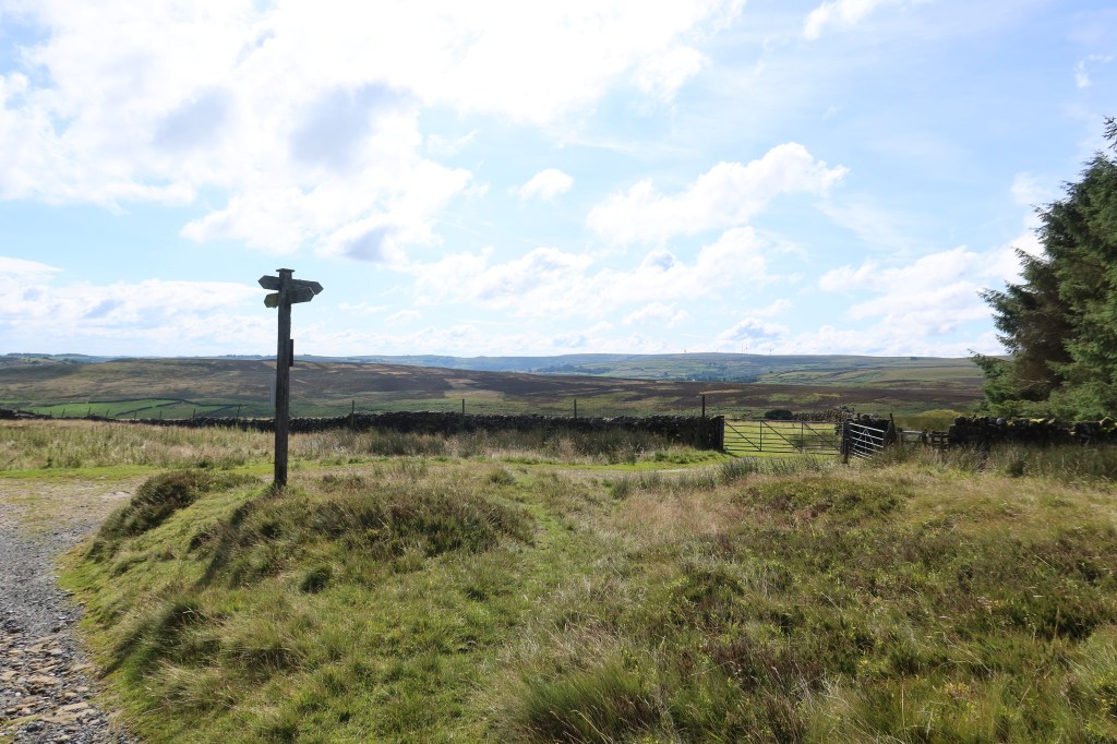 From the ruins, continue down the pathway, ignoring the right-hand turn down to Bronte Falls for now. Follow the Pennine Way just a little bit longer until you come to the signpost and junction in the photo below. A tell-tale sign you are getting near is the copse of trees which you need to be right next to before you turn right.