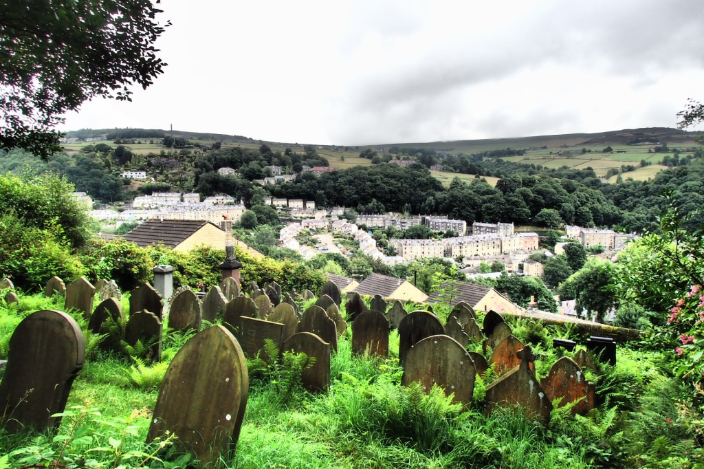 Despite its steepness, this is an excellent route towards higher ground, and you will pass a Commonwealth Graveyard on your right before meeting the first road. At the top, turn right, then immediate left, and look out for a Public Footpath signpost on your left. Take this, through some woodland, and up some stone steps set a worrying angles. At the road, turn right, uphill, towards Heptonstall. Continue up the road, turning to cobbles, and you will see a sign on your left for a heritage trail around the churchyard.