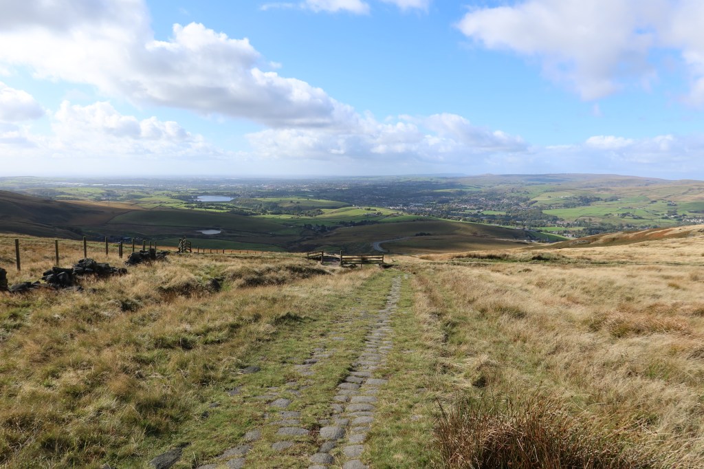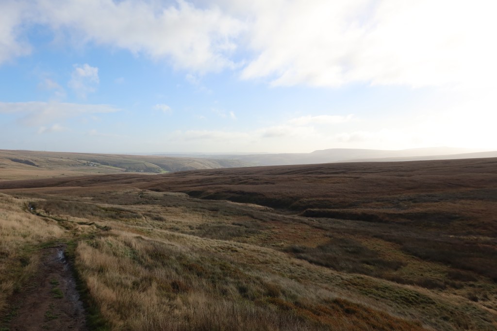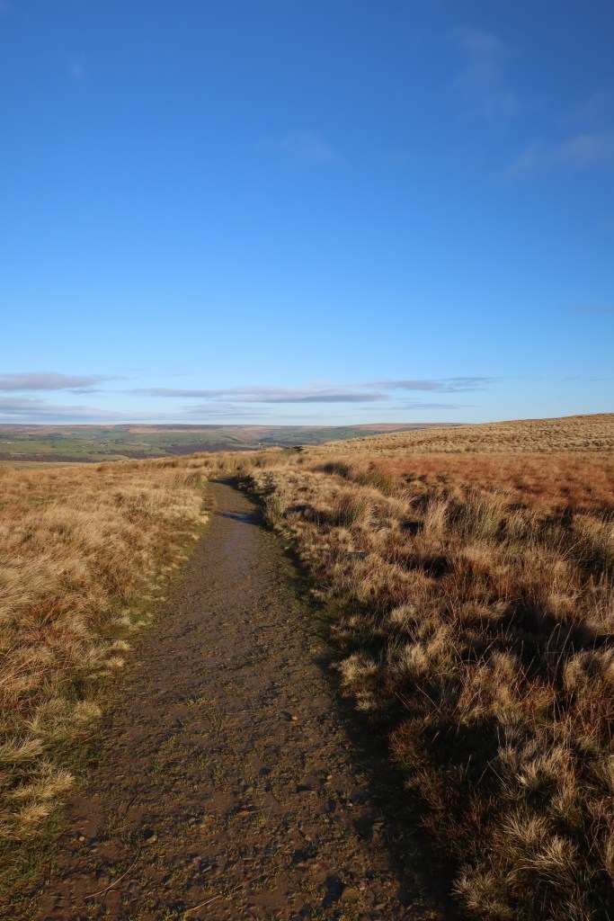 Cross the A640, and carry on the Pennine Way as it heads towards White Hill. One a good clear day you can see west across the countryside to the towering skyscrapers of Manchester.