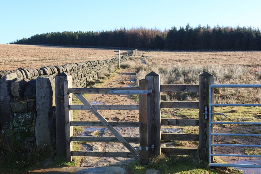 Follow the Pennine Way as it curves around to the right of this monument, and down to a gate. Shortly after the gate, head left by a signpost, in the picture below.