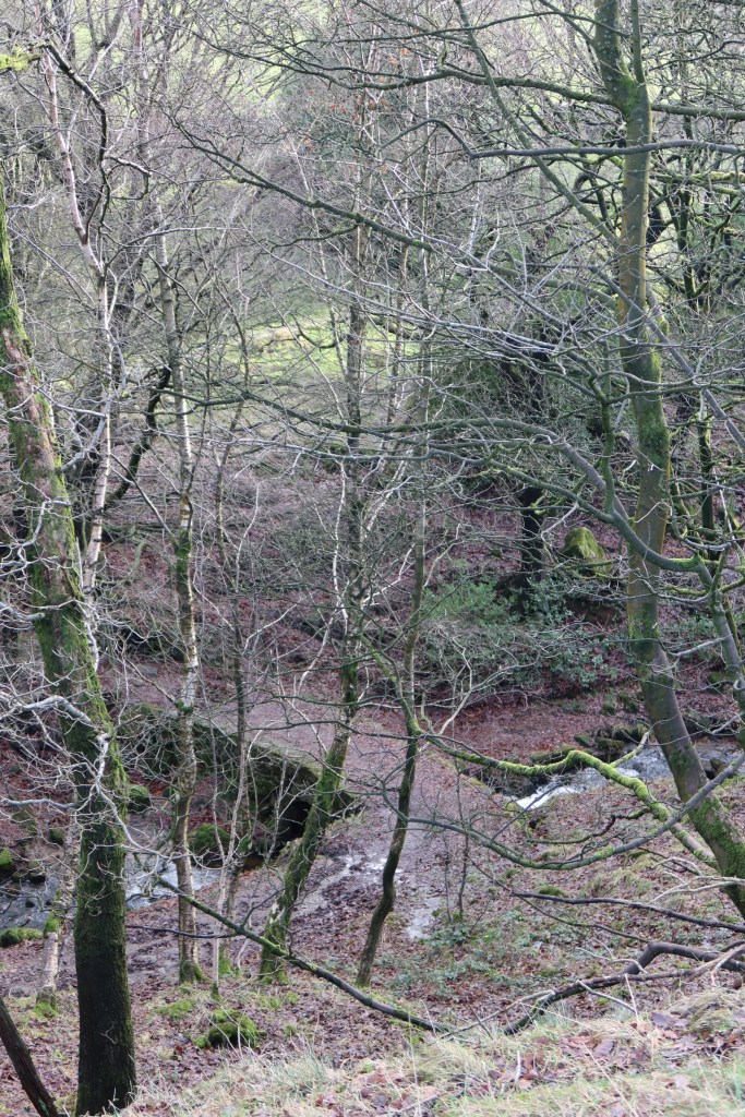 But caution is needed here, right at the end of a long day – the Heritage Trail does not follow the Pennine Way down into the valley all the way. Instead, it turns off to the right, over a stream, and then follows a track at the top of some woodland down into Hebden Bridge directly. Turn off point in the photo below: