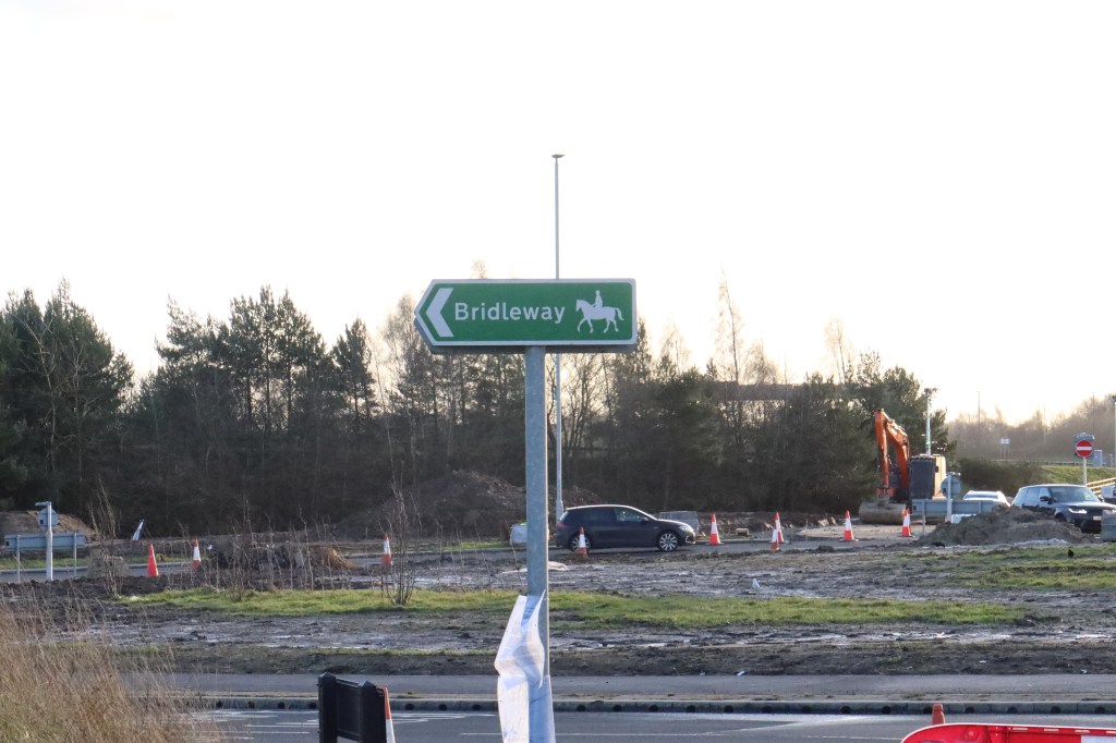 To your right you’ll see a minor road heading up towards a busy A road and bypass system. These all have pavements, so you should head up to the main roads, and head left. Follow the road, passing a major shopping complex on your right-hand side, until you see this sign pointing left: