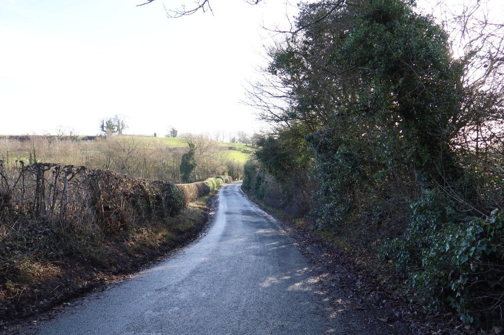 Pass some houses, curve round to the left, and then cross a road and go straight on. The path becomes even muddier (almost like a swamp when I walked through) with a hedge on your left. At the first hedge going upwards on your right, follow it with the field open on your right-hand side. Continue up and over the field, ending up at the corner on the other side. Follow the path through the corner.