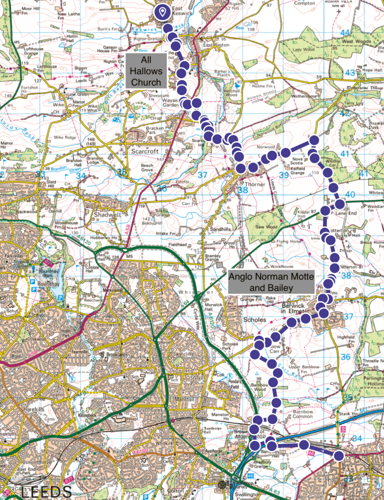 From Gateon House Lane (the end of Section Three), turn left on Wike Lane, and then immediately right again onto Keswick Lane. Walk past Rigton Grange and turn right on Woodacre Lane. Go straight on towards All Hallows Church at Bardsey, our first historical site of interest.
