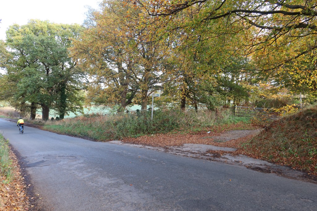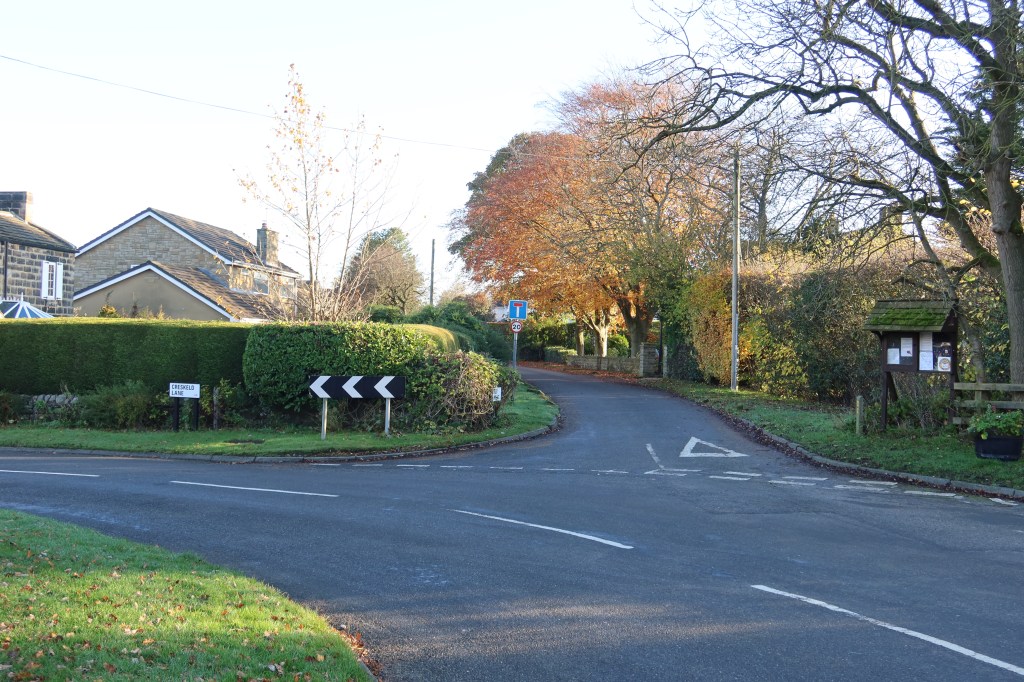 At the road, again busy, cross over and you will see a public footpath on the other side. Instead of following the path, head right, on the pavement, until you reach a cycle lane heading left towards Bramhope. Take the cycle lane and keep following the road, turning neither right nor left, until you reach the junction pictured below.