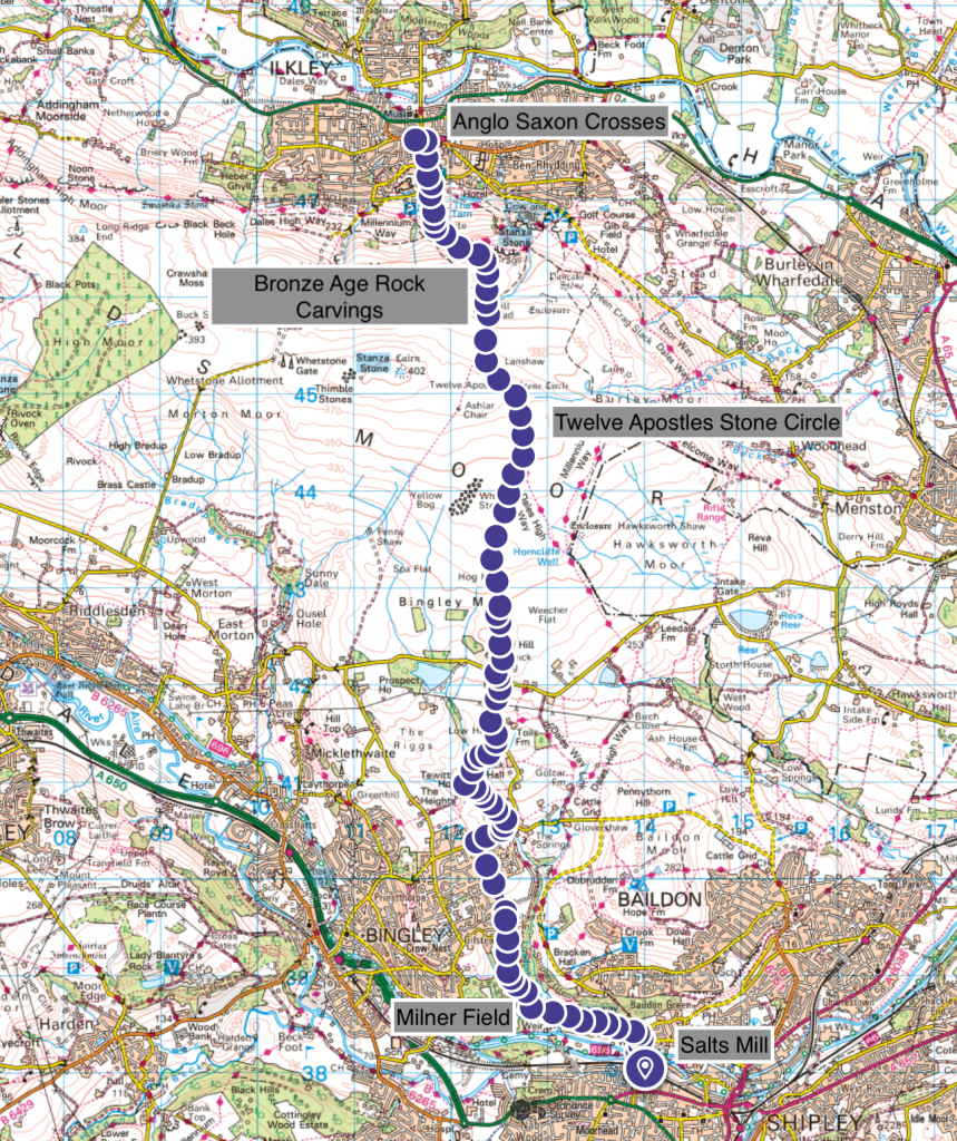 Bronze Age rock carvings (c.2000BC) and Stone Circle, Anglo-Saxon crosses (C9th), Salts Mill (1853) and Milner Field (1871)